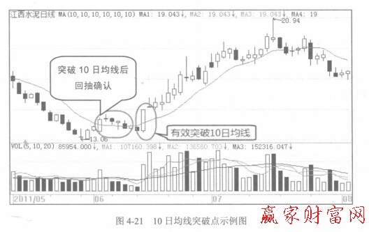 比如,江西水泥(000789)在2011年5月股價連續(xù)下跌,到月底上行突破10 日均線,但隨后便繼續(xù)下跌,進行回抽確認。直到6月14日,一根大陽線有效突破I0日均線,股價才一路報升。如圖所示。