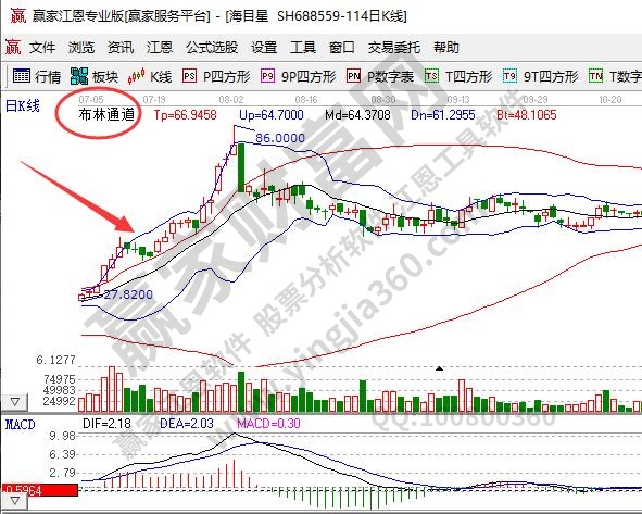 當個股在上,中,下,三軌來回波動時,投資者可以選擇股價受到中軌道支撐和反彈的個股作為自選個股進行參考,然后結(jié)合其他指標尋找買賣點。如果一只股票的股價突破了遠離上軌道的上方, 向下沖擊上軌道,意味著經(jīng)過一段時間的股價上漲,獲利板塊已經(jīng)出逃,拋售壓力相對較大,后期股價可能會大幅下跌,投資者可以遠離這類股票。