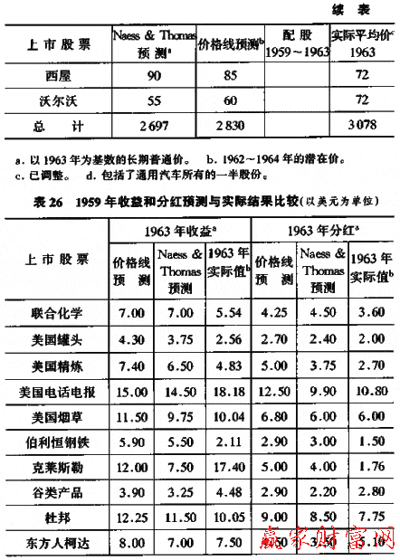 在表25和表26中,列出了1959年所作的評價。這是基于1963年或1962年至1964年的情況作出的,并且還列出了1963年的實際結(jié)果。在第3章,我們曾經(jīng)討論了這些預(yù)測中的收益和分紅的比例,表明它們在總價中的比例過高;相反,價值或價格的預(yù)測與1963年的實際平均價格相比有下墜的趨勢,并且在1963年和1964年低于最高水平。