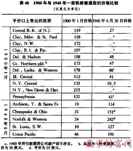 將本世紀初紐約證券交易所的鐵路股票清單和1948年的相同清單進行比較是有益的。盡管一些公司已經通過合并或其他一些形式而消失,但幾乎所有比較重要的股票都能容易地被跟蹤到1948年的情況。突出的事實是,每一種以高出1900年平均值出售的股票已經喪失了它的大部分價值;相反地,所有以高出1948年平均值出售的鐵路股在1900年的估價相當的低。表48給出了列于紐約證券交易所的普通股的可比較價格。