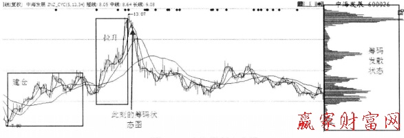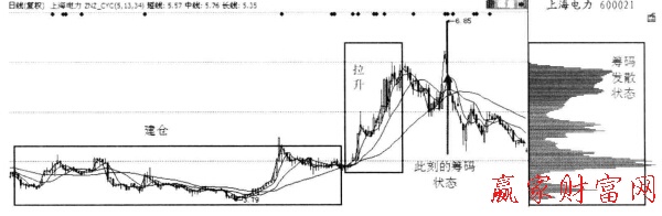 如圖1所示是上海電力的一段歷史走勢圖。左邊的2個方框分別為莊家建倉和拉升區(qū)域,箭頭所標(biāo)注的為籌碼分布狀況所選定的交易日,右邊的方框標(biāo)注的是籌碼分布圖。值得一提的是,籌碼分布狀況顯示的是各投資者成本的分布情況。