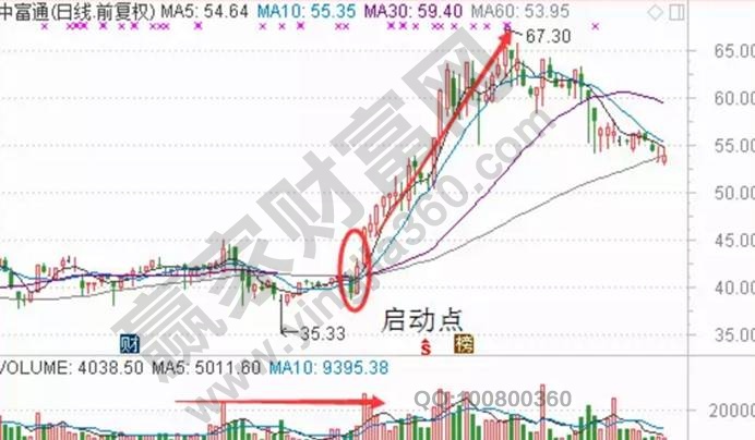 這個右上角強勢進(jìn)攻型的股上漲利潤空間是非常大的,如下面的中富通走勢圖。股價的啟動點在短期線金叉中軌后放出三倍量平臺突破,這種票的爆發(fā)力來自前面箱體或者平臺的拉鋸洗盤的蓄勢,止損以短期線作為保護(hù)即可;一般來說股價在右上角附近徘徊獲利與解套的風(fēng)險壓力較大,但是反作用力也大。