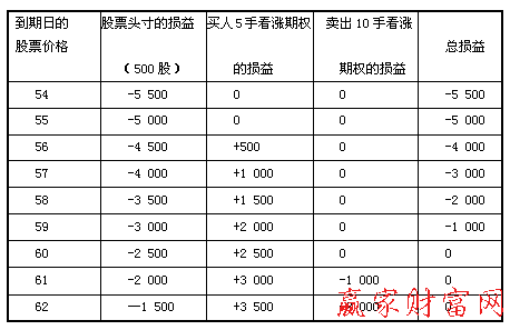 買(mǎi)入5手6月執(zhí)行價(jià)格為55美元的看漲期權(quán),權(quán)利金為每股4美元;賣(mài)出10手6月執(zhí)行價(jià)格為60美元的看漲期權(quán),權(quán)利金為每股2美元。