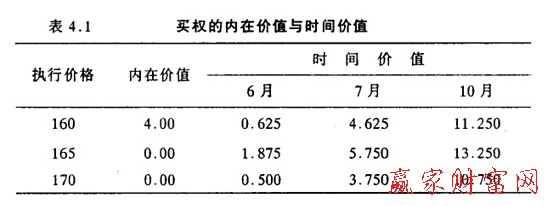 通常美式期權的價格大于其內在價值,其間的價差就是時間價值(Time Value),或稱投機價值(孫eculative Value)。它等于C. (S, T, E)一Max (0, S一E)。時間價值反映T投資者愿意為標的資產的價格的未來的不確定性支付代價。表4.1表示的是一買權的內在價值和時間價值,可見,時間價值隨到期時間的增長而增長。