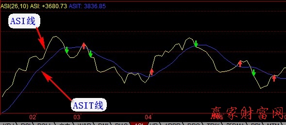 該指標(biāo)中的ASI線是以開盤價(jià)、最高價(jià)、最低價(jià)、收盤價(jià)為基礎(chǔ)計(jì)算出的一條曲線。該指標(biāo)的波動(dòng)幾乎與對應(yīng)股價(jià)或指數(shù)同步,因此,投資者可以將該指標(biāo)看作是股價(jià)走向的領(lǐng)先指標(biāo)來判斷股價(jià)的走向。而ASIT線則是ASI線的移動(dòng)平均線,投資者可將其作為ASI線的輔助指標(biāo)使用。