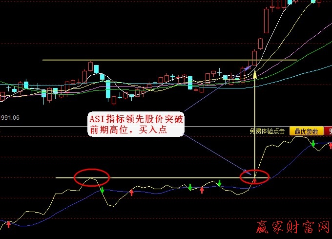 ①ASI指標(biāo)領(lǐng)先股價(jià)突破前高時(shí)買入股票