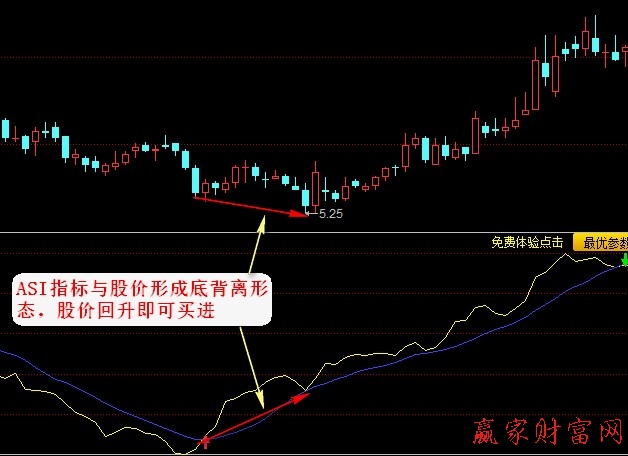 ②股價(jià)與ASI指標(biāo)底背離買入股票