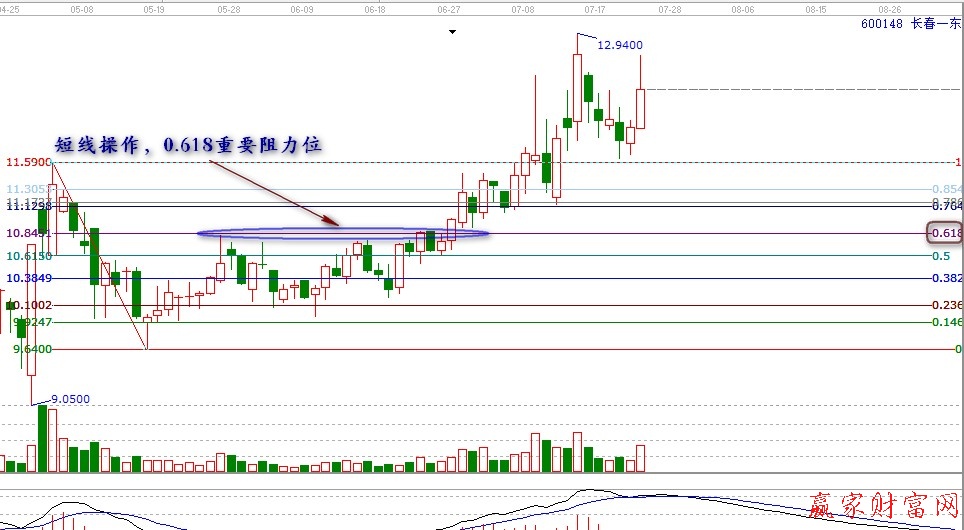 從上面我們可以看出,黃金價格回調(diào)支撐對于個股長期走勢把握很精準,這個對我們長線操作股票的朋友幫助很大,我們可以以此確定股價最終目標。下面我們對該股近期的走勢分析下,看看在波段操作中,該股是否也能有同樣的作用。我們對2011年3月底的高點及2012年12月份的低點形成的這波下跌行情進行黃金分割,依據(jù)軟件作圖規(guī)則,做出相應的分析圖,如下。我們發(fā)現(xiàn)該股在反彈過程中,在0.382與0.5位置都曾遇到阻力,但最后都能放量突破,而且該股在2014年7月14日當天有上攻0.618位置,遇阻后回踩0.5支撐,短線來看,該股目前還會上攻0.618位置。可見,我們通過對近期的分析,也是可以把握一個完整的波段的。