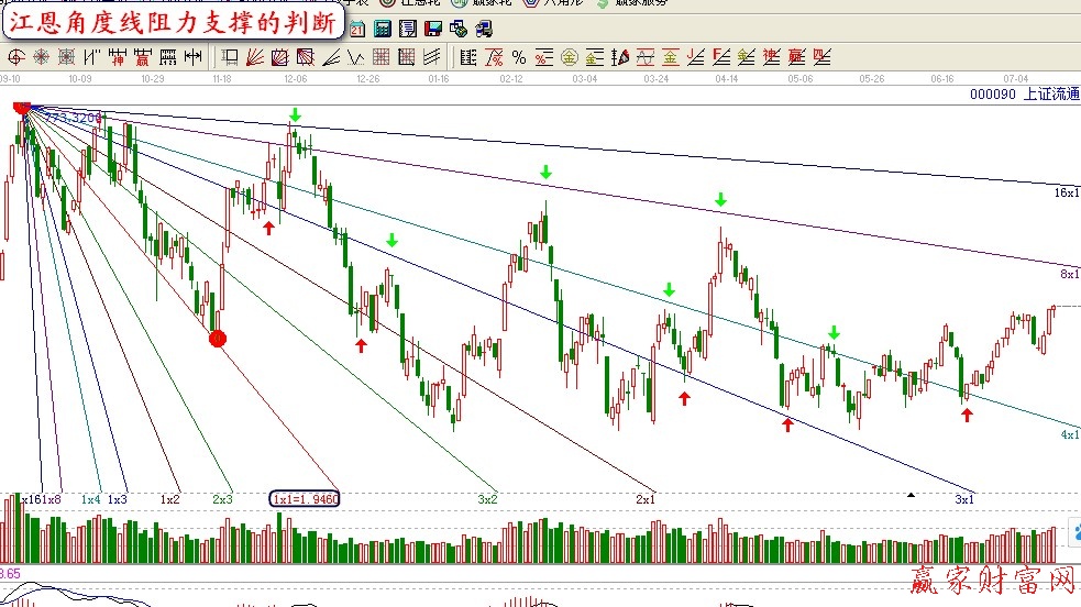 江恩角度線是由時間單位和價格單位來定義價格運動的。江恩在X軸上建立時間,在Y軸上建立價格。然后選擇市場顯著的高點和低點,按照時間與價格之間不同的比例關系畫出不同的上升江恩角度線和下降江恩角度線,用符號“TxP”來表示。其中,T為時間,P為價格。投資者可以根據這些角度線和交叉點,確定市場將發生反轉的時間及市場將反轉到什么程度。