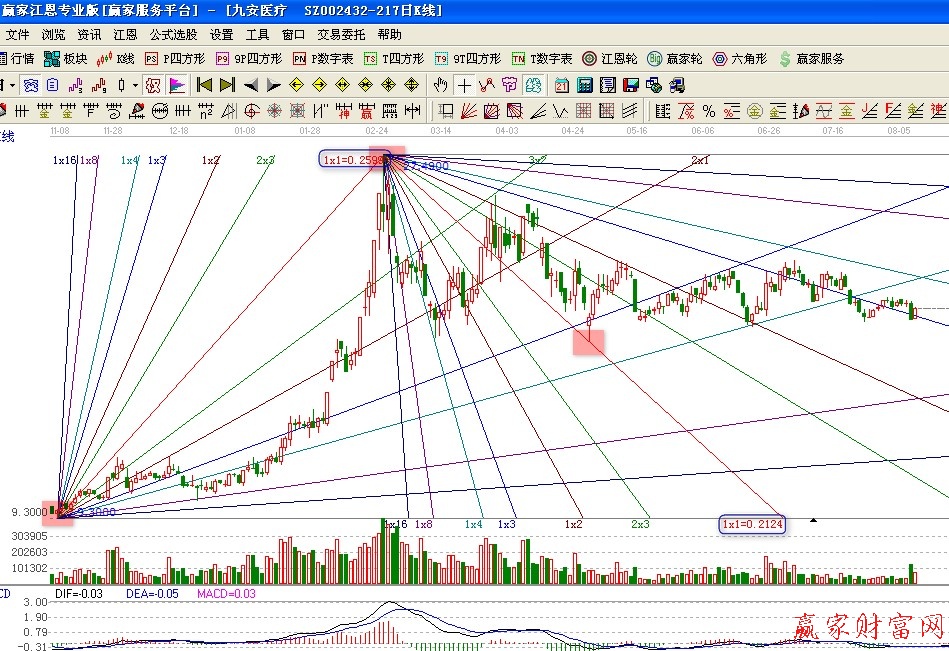 通過這兩個,我想大家也明白了,江恩箱沒有一個明確的畫法。也不會像趨勢線、黃金分割那樣有一個固定的模式讓你去套用。江恩箱是非常靈活的一種畫線工具。需要股友們長期的實踐和測試,還需要多觀察多修正,這樣才能畫出一副完美的江恩箱。