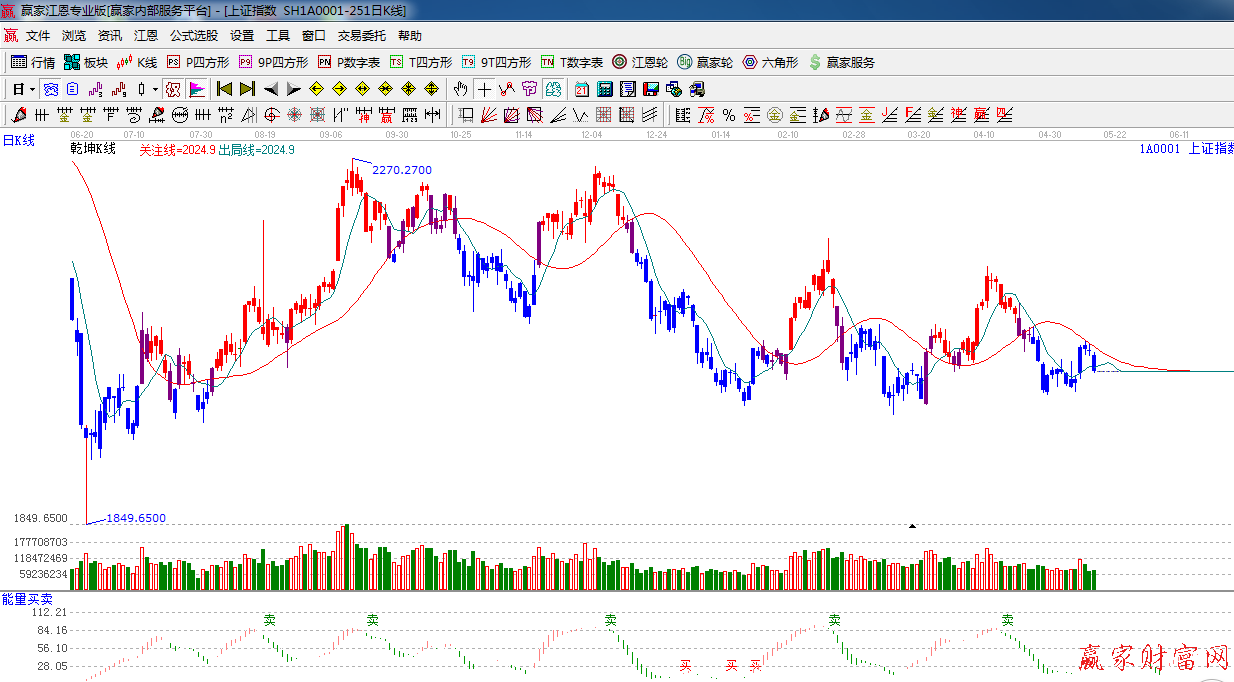 ☆依據贏家江恩系統乾坤K線提示: 依然處于藍色休息區域,放量突破出局線,仍處于關注線下方