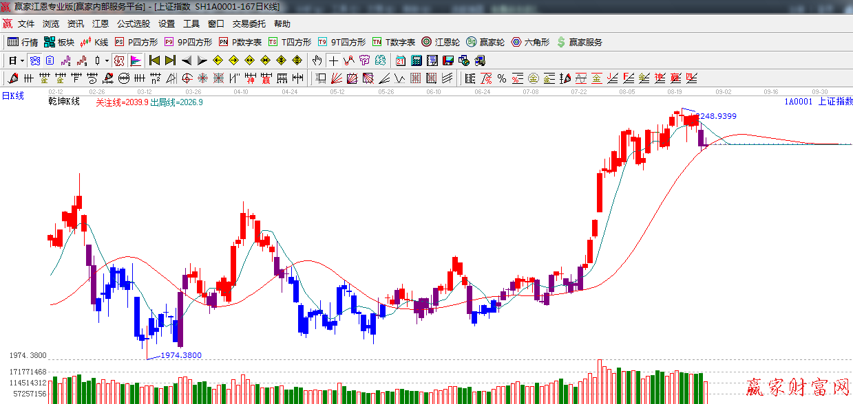 ★依據贏家江恩系統乾坤K線提示:紫色十字星,紫色k線代表警示,出局線短線看空,紅色關注線決定波段。