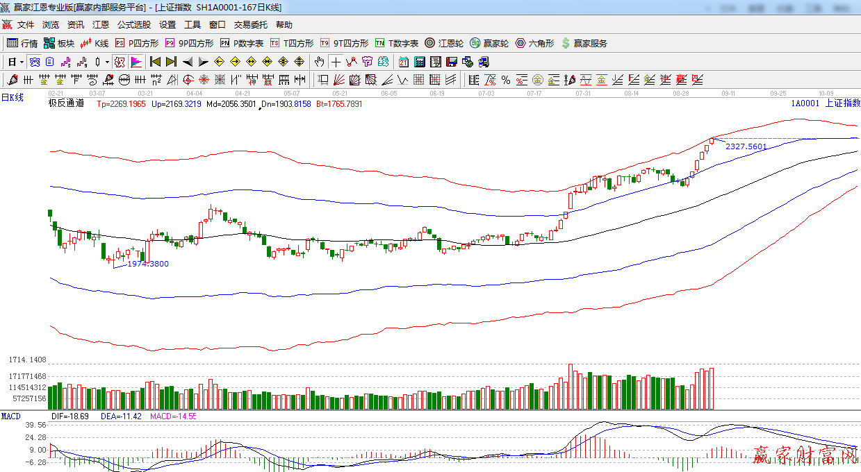 上周,滬深兩市在資金推動下,呈單邊上漲走勢,連續(xù)突破2250點(diǎn)以及2300點(diǎn)兩大阻力位,刷新年內(nèi)新高,板塊方面出現(xiàn)普漲,其中航天軍工、港口等板塊更是表現(xiàn)突出,截止周五收盤,上證指數(shù)已經(jīng)站上了2326點(diǎn),上周五又是前期提到的時間之窗,指數(shù)又面臨上方極反通道紅色外軌壓力,短期將結(jié)束前期伶俐走勢,轉(zhuǎn)入震蕩,預(yù)計(jì)本周將沖高回落,操作上,謹(jǐn)慎為主。