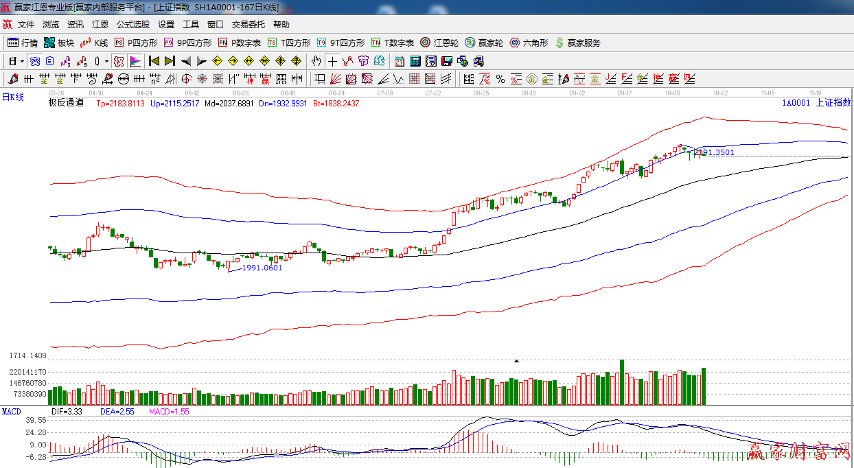江恩看盤綜述:依據贏家江恩技術工具分析得出:今日指數反抽外軌線后回落,以長上影線的陰錘頭線報收,本 周市場整體走勢應驗了上周五的分析,另外,外圍市場持續大跌,對指數將形成一定的壓力,加之四中全會的關鍵時 間點臨近,市場的短期調整也理所應當,因此,保持短期調整,中線看好的判斷。操作上,前期漲幅過大個股可逐步 保護利潤,倉位控制在3成左右。