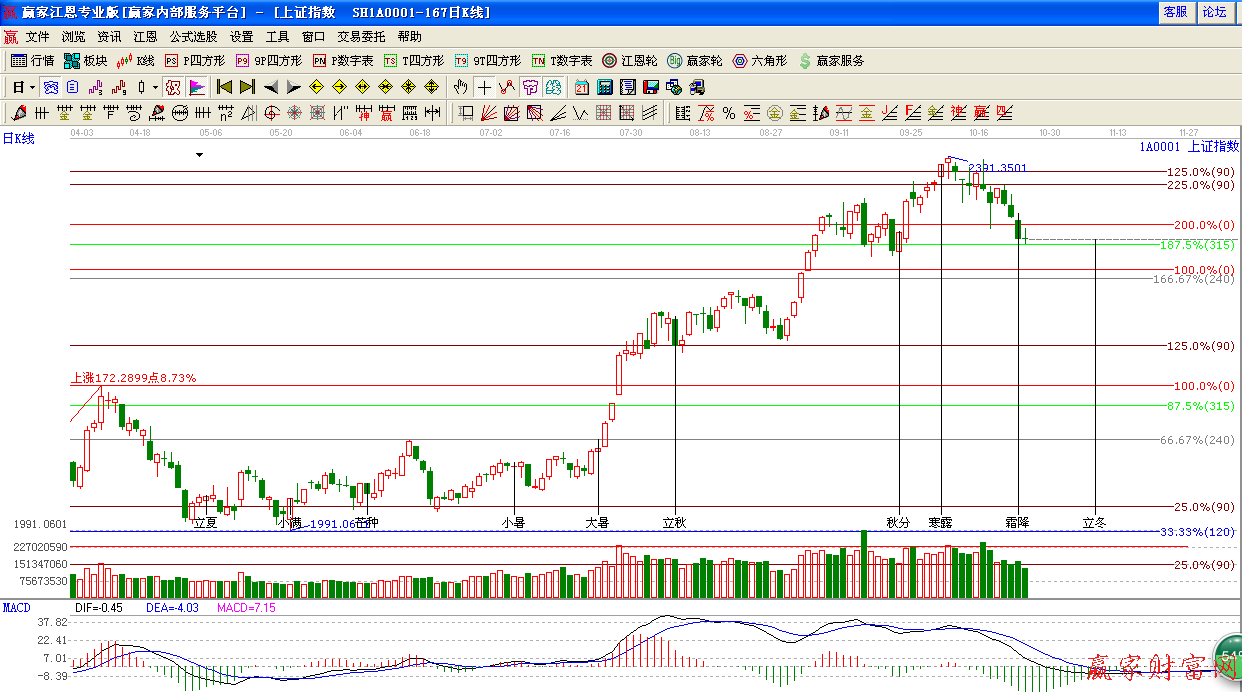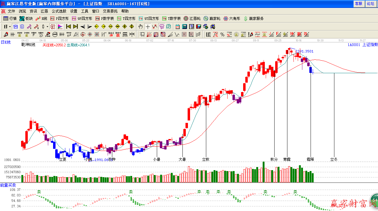 ☆依據贏家江恩系統黃金時間周期線提示:霜降節點,指數回踩生命線支撐,短期關注此位置支撐。