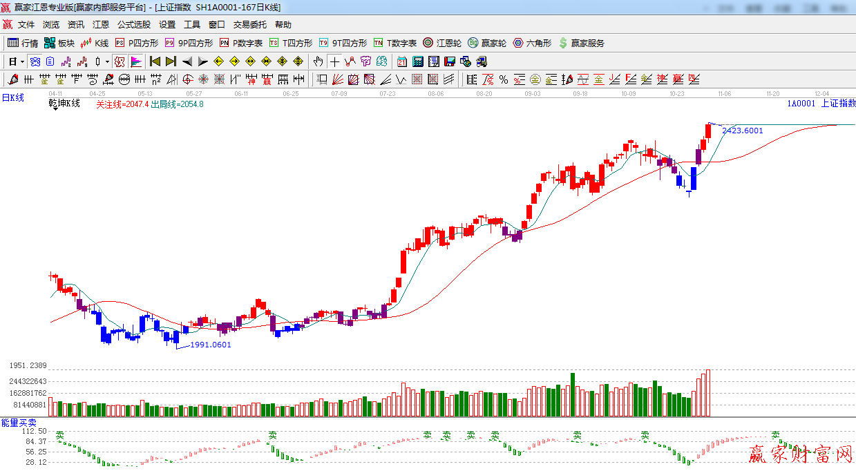 ★依據(jù)贏家江恩系統(tǒng)能量買(mǎi)賣(mài)提示:紅色看多能量柱增長(zhǎng),看多。