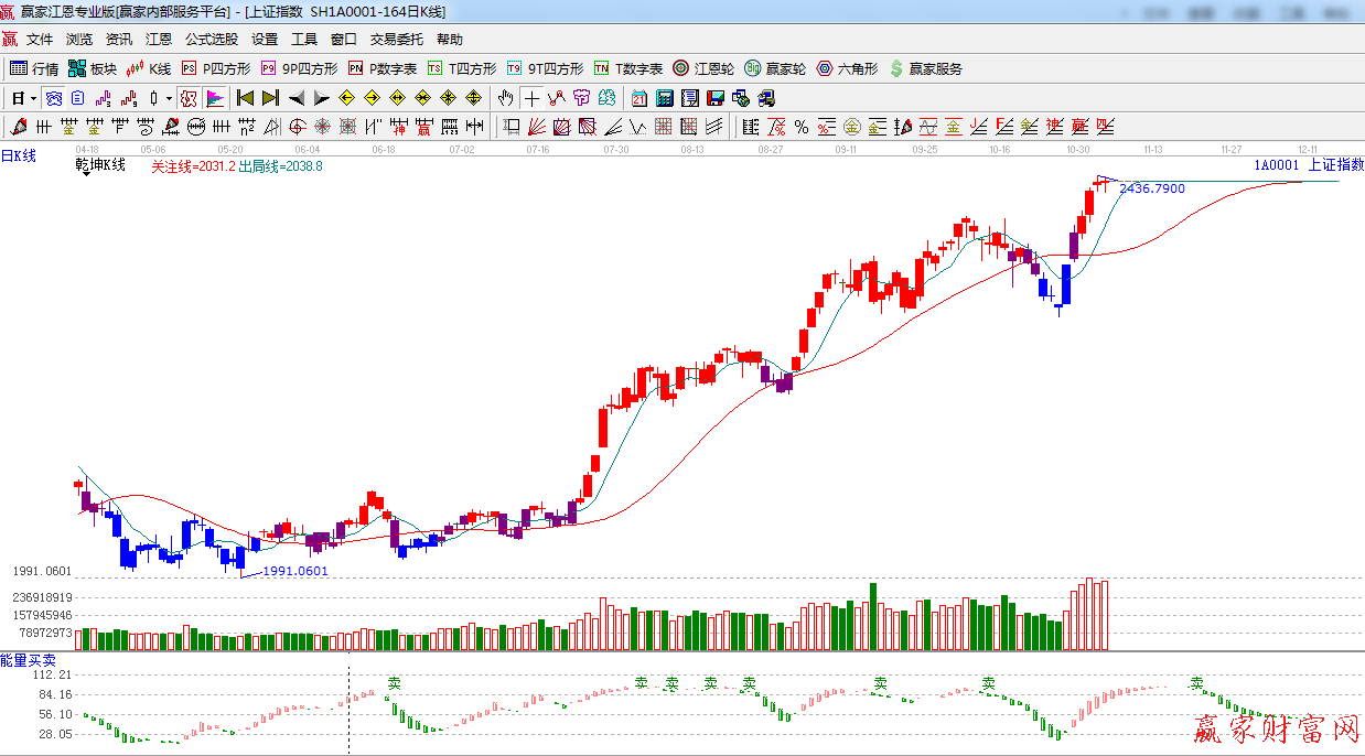 ★依據贏家江恩系統能量買賣提示:紅色看多能量柱增長,看多。