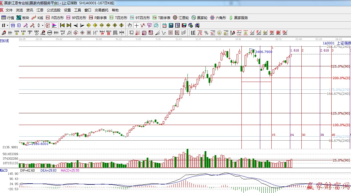 ★依據(jù)贏家江恩理論系統(tǒng)波段百分比提示:短期上方阻力位是江恩百分比240度,3436點(diǎn),270度,3486點(diǎn),支撐90度3188點(diǎn)。