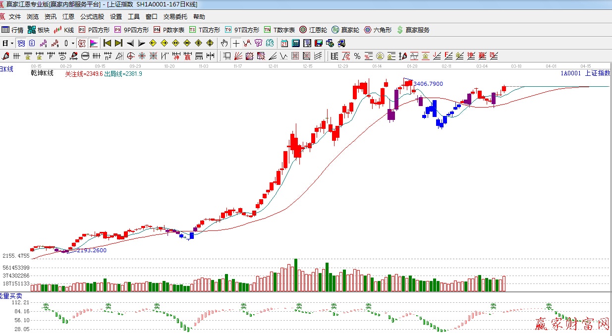 ★依據(jù)贏家江恩理論系統(tǒng)乾坤K線提示:紅色k線,短線出局線之上,紅色關(guān)注線之上,看多。