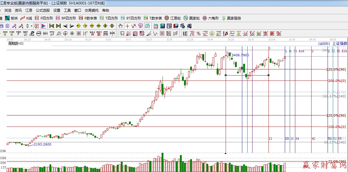 ☆依據(jù)贏家江恩理論系統(tǒng)黃金時間周期線提示:下一時間窗口留意3月17日附近。