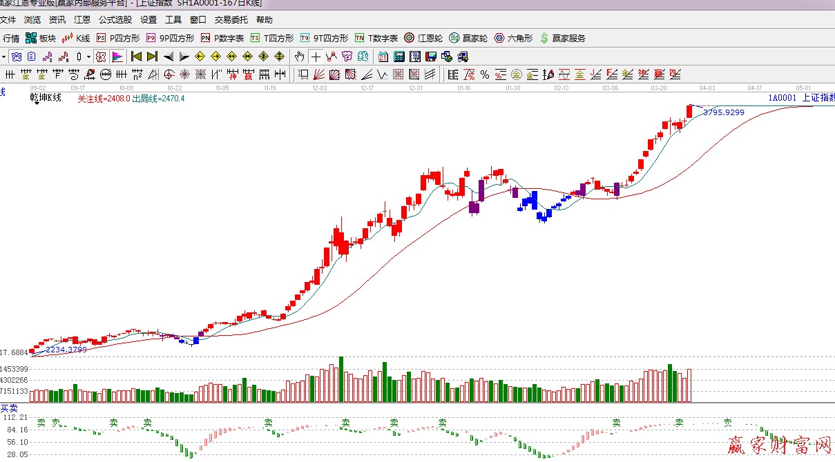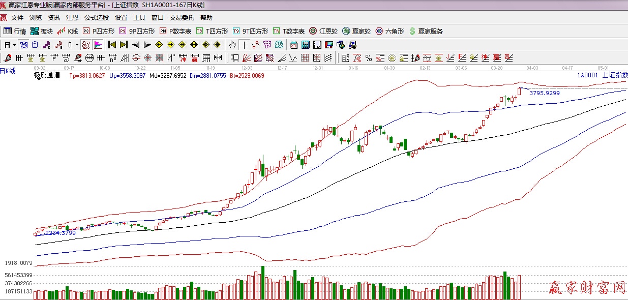 ★依據贏家江恩理論系統極反通道提示:滬指經過在藍色外軌線上方震蕩整理,今日如期再次走強,上行靠近紅色外軌線,短期謹慎為主。