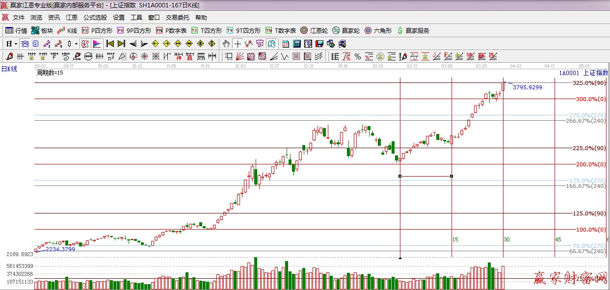 ★依據贏家江恩理論系統波段百分比提示:滬指圍繞江恩0度位置整理后,今日如期走強,并突破了江恩90度(3783點)位置,明日留意能否站穩90度位置。