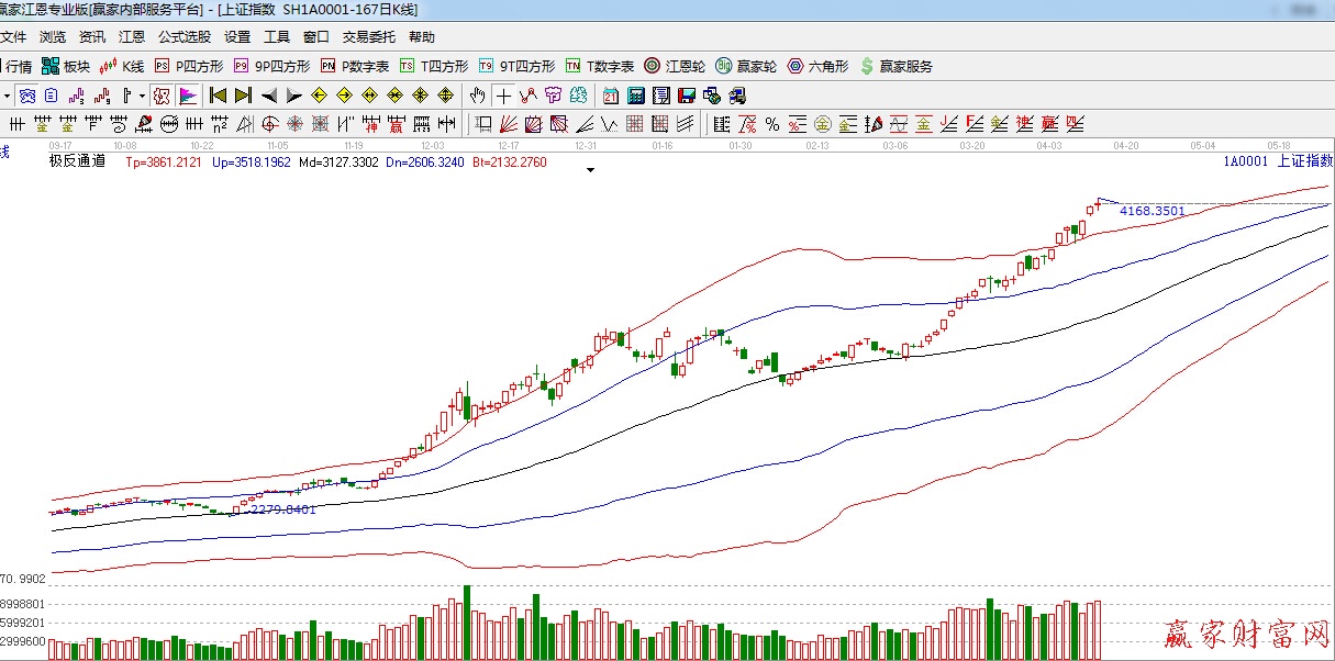 ★依據贏家江恩理論系統極反通道提示:極反通道紅色外軌線支撐上方,繼續走強,強勢格局延續。