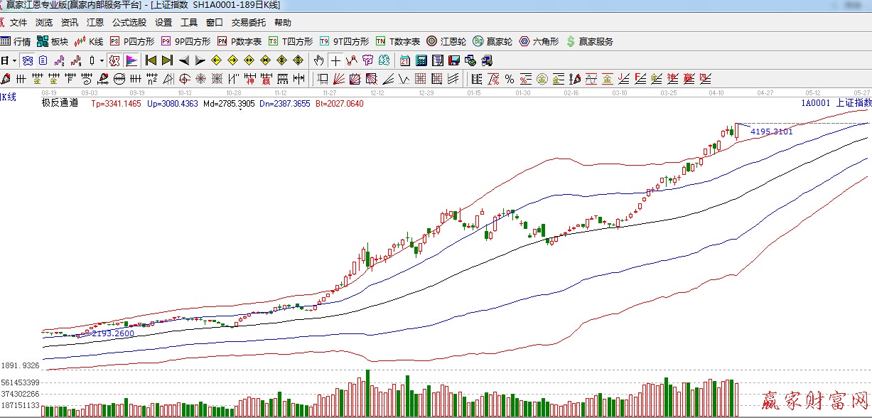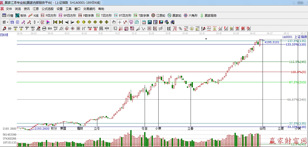 江恩看盤綜述:依據贏家江恩技術工具分析得出:周四滬深兩市震蕩走高,午后小幅回落,滬指尾盤再度拉升,依據江恩百分比分析江恩120—135度(4082--4157)位置轉換為支撐,回踩不破將繼續看高,但白酒、環保、電力等防御性較強的板塊開始大幅上漲,短期或許預示著調整將逐步展現,下一時間窗口是谷雨4月20日,操作上,適當控制倉位,逢低關注近期漲勢相對落后的國資改革、業績超預期個股,環保、水利等板塊可留意。