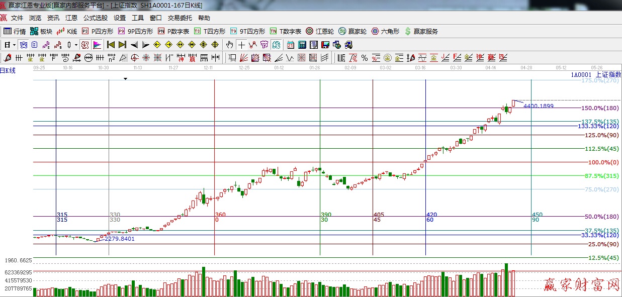 ★依據(jù)贏家江恩理論系統(tǒng)波段百分比提示:江恩百分比180度4300點(diǎn)附近支撐線,此位置不破整體趨勢(shì)不變,上方下一目標(biāo)位是270度,4700點(diǎn)附近。