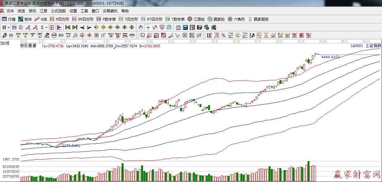 極反通道提示:紅色外軌超強區域,趨勢強勢,看多。