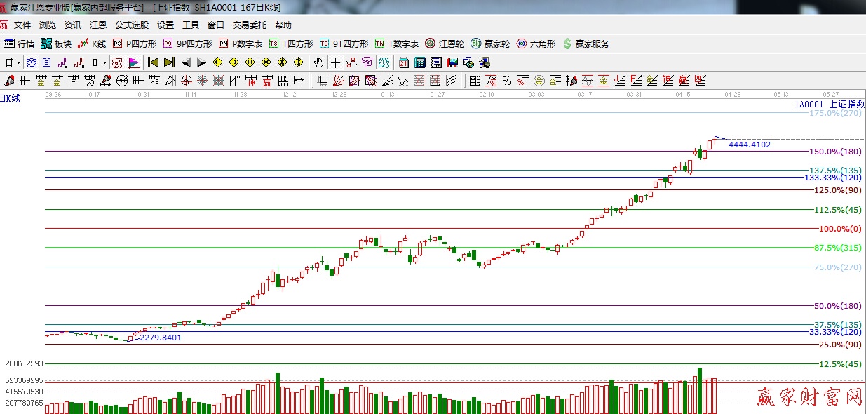 江恩看盤綜述:依據贏家江恩技術工具分析得出:周四市場強勢震蕩,午后滬指在運行至4444點后出現快速跳水,4444這一點位引起投資者無限遐想,這中數字游戲更多的是一種娛樂色彩,依據江恩價格工具分析,江恩180度4300點支撐位置不破,市場整體將進入慢牛階段,下一目標位是270度,4700點附近,操作上,利用盤中震蕩機會,逢低介入近期漲勢相對落后的國資改革、業績超預期個股。