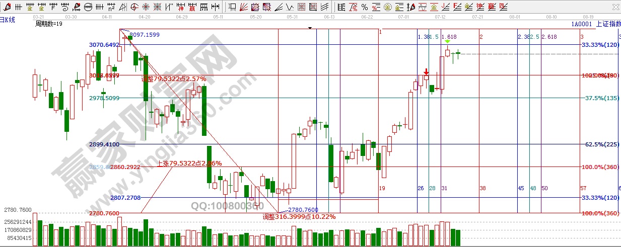 ☆依據贏家江恩理論系統江恩波段百分比線提示:上方阻力3070點,以及前高3097點附近,短周期支撐3035點附近,90度3018點.