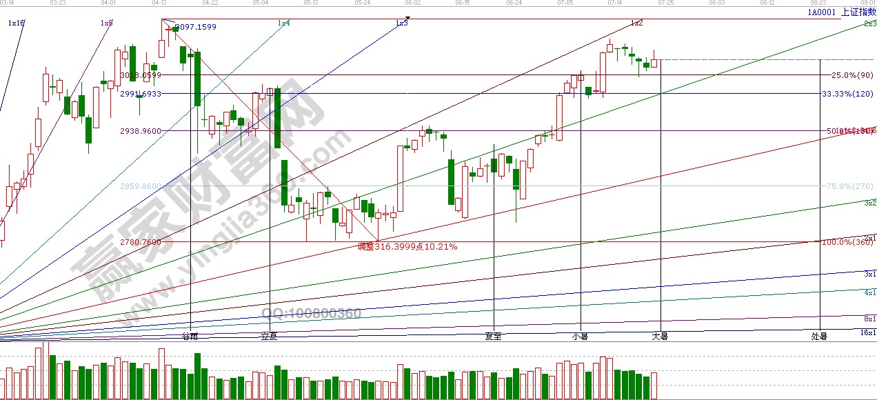 江恩看盤綜述:依據(jù)贏家江恩技術(shù)工具分析得出:周四,是21日時(shí)間窗口,兩市指數(shù)盤中震蕩較大,整體成沖高回落走勢(shì),最高沖至3053點(diǎn),由于量能不濟(jì)展開(kāi)回落,周五是大暑節(jié)氣,如仍不能放量收復(fù)3055點(diǎn),3070點(diǎn)的話,預(yù)計(jì)短期內(nèi)震蕩調(diào)整仍為主基調(diào)。大暑后下一時(shí)間點(diǎn)在8月1日附近。操作上,可梳理半年報(bào)相關(guān)標(biāo)的,提前布局具有業(yè)績(jī)和數(shù)據(jù)支撐的高成長(zhǎng)績(jī)優(yōu)股。