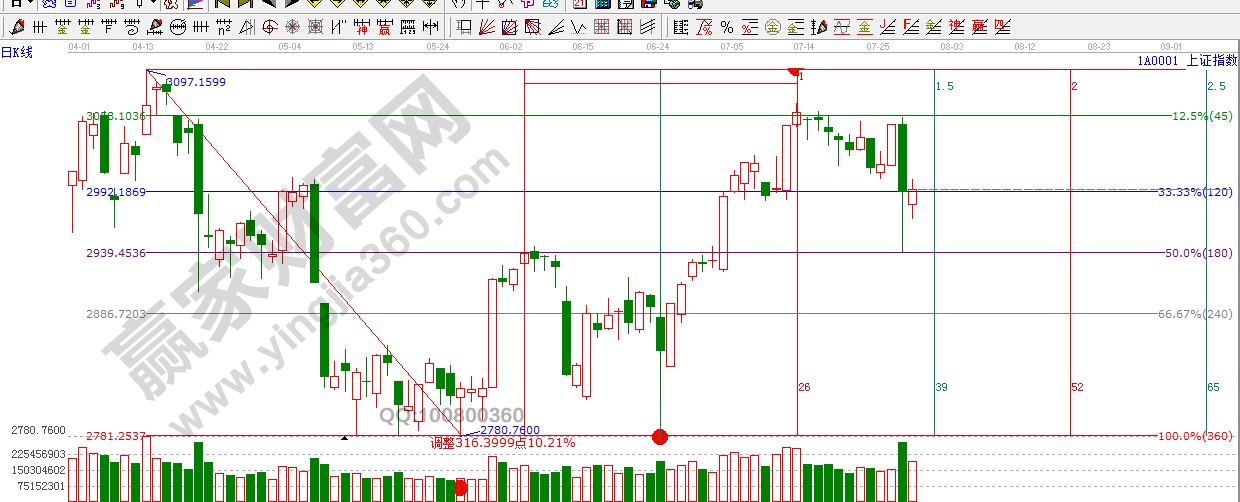 江恩看盤綜述:依據贏家江恩技術工具分析得出:周二大盤放量大跌至日線生命線和180度共振支撐位置,此位置下跌為洗盤性質,不必過于恐慌,周四的回升預示短期修復行情的展開,支撐依然是2939點附近,時間上8月1日是一個關鍵窗口,短期修復后震蕩上行仍是大勢所趨,操作上,重點關注當下業績支撐明顯的標的股。