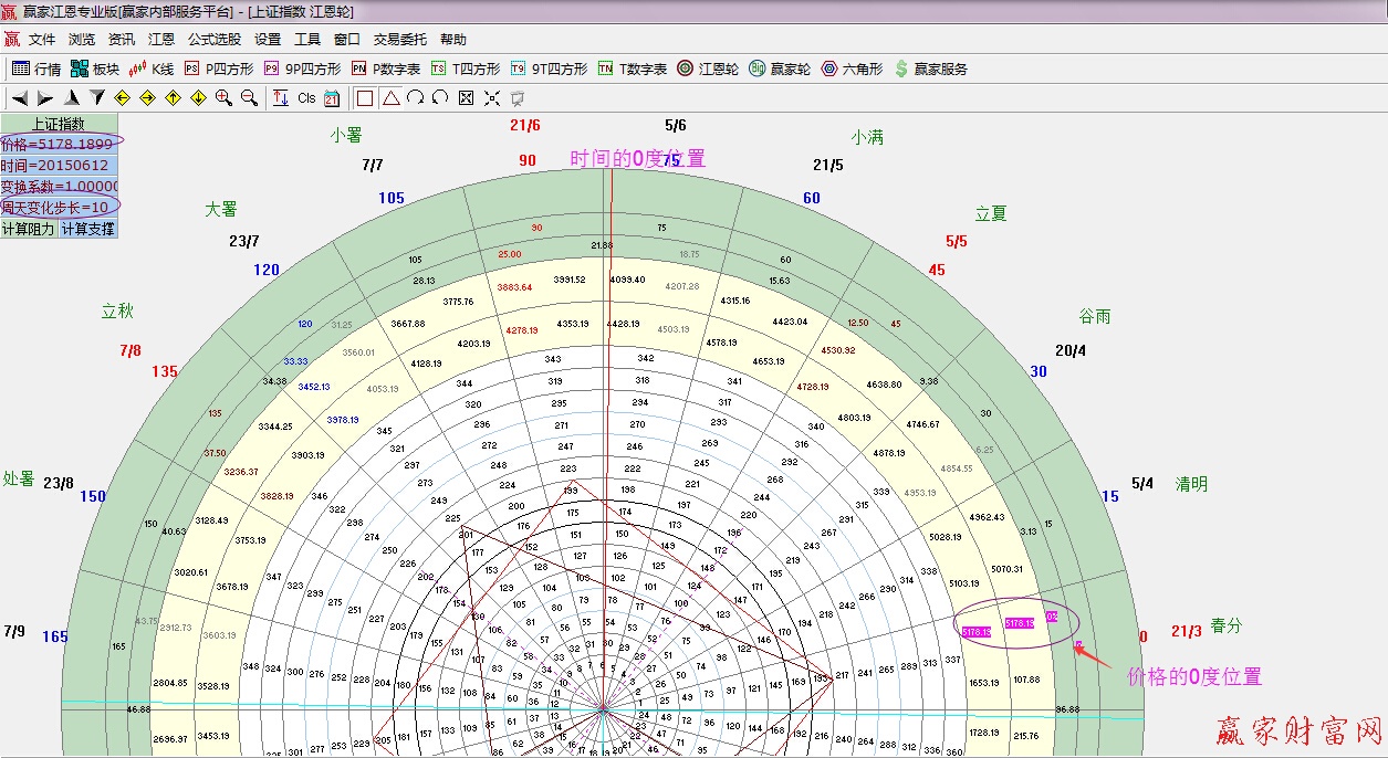 今年的高點(diǎn)是5178點(diǎn),和24節(jié)氣"芒種"吻合,首先,選點(diǎn)5178點(diǎn)上方點(diǎn)擊鼠標(biāo)(會出現(xiàn)一個(gè)小三角),證明選點(diǎn)成功,下面打開江恩輪 ,觀察價(jià)格,時(shí)間和你的選點(diǎn)是否吻合,變換系數(shù)不用更改,周天變化歩長可以放大或縮小10、100的倍數(shù)。我們把歩長調(diào)成10,然后點(diǎn)擊上邊調(diào)試欄的旋轉(zhuǎn)按鈕,是三角形和四方形的結(jié)合點(diǎn)對準(zhǔn)起點(diǎn)位置【如下圖】,點(diǎn)擊計(jì)算支撐。