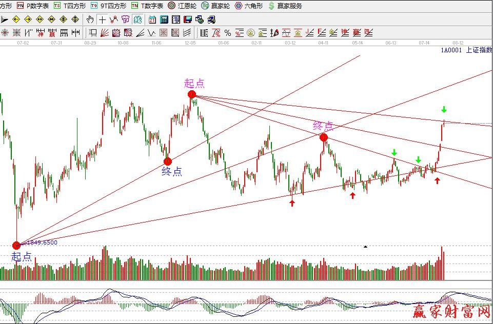 從2014年7月30日開始之后,大盤開始在下降速度阻力線的1/3速度阻力線位置盤整,其后還出現回踩的一次,但是最終沒有跌破這一支撐線后一路上揚到上升阻力線2/3速度阻力線位置進行壓力突破和確認,歷時兩個月后才繼續上漲行情,之后指數因為證券、銀行和保險等權重股的帶動下,一去不回頭,沖出了阻力線走出新的行情。7月30日到現在差不多五個月了,最近卻讓我又感到了震撼,不得不說江恩理論是值得我們后人去學習研究的。江恩速度阻力線更多神奇之處等待大家的研究和開發,在股市操作中只有自己用心才會有收獲,希望大家收獲自己的財富。