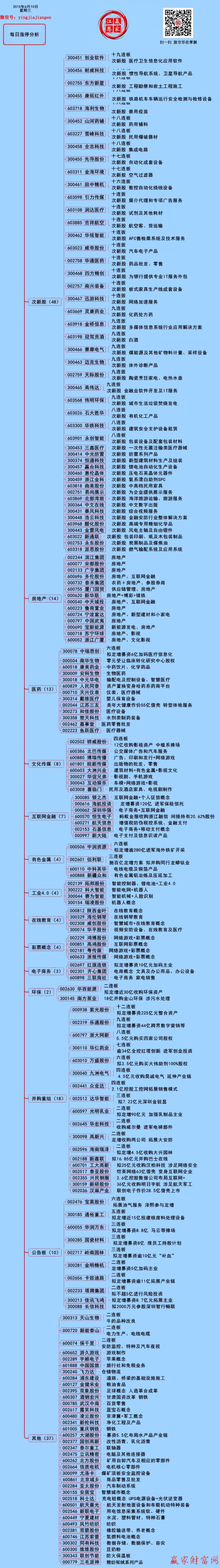 盤(pán)面上看,次新股、文化傳媒、全息技術(shù)、3D打印、網(wǎng)絡(luò)游戲等板塊漲幅靠前,交運(yùn)設(shè)備、風(fēng)能、海工裝備、機(jī)械、鐵路基建、中字頭、核電、煤炭等板塊跌幅領(lǐng)先。另外,全天有近180只非ST股漲停。今日上市的8只新股中國(guó)核電等均達(dá)漲幅上限。中國(guó)中車(chē)今日再度大幅下挫,跌幅逾9%。以下將對(duì)部分股票漲停原因進(jìn)行分析: