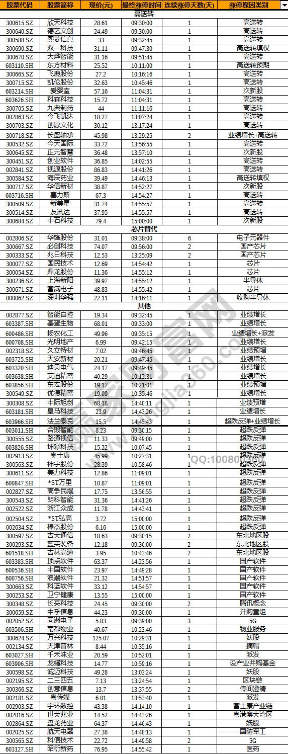 盤面上,政策面重提“擴大內需”,周期和地產股大漲,久立特材(002318)、光明地產(600708)、南都物業(603506)、世榮兆業(002016)漲停。高送轉板塊掀漲停潮,今天國際(300532)、凱倫股份(300715)、智能自控(002877)等逾15只個股漲停。華鋒股份(002806)6連板帶動妖股板塊集體反抽,龍頭必創科技(300667)、萬興科技(300624)、誠邁科技(300598)、九典制藥(300705)等妖股漲停。芯片概念午后強勢拉升,兆日科技(300333)、上海新陽(300236)、國民技術(300077)等個股漲停。