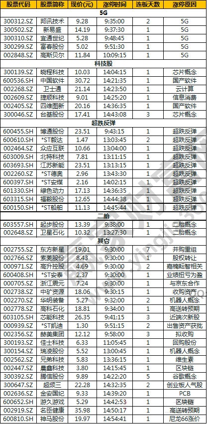 盤面上,《擴大和升級信息消費三年行動計劃(2018-2020年)》印發,5G板塊大幅走強,富春股份(300299)、高斯貝爾(002848)、新易盛(300502)、宜通世紀(300310)、衛士通(002268)、邦訊技術(300312)等多股漲停。多地推二孩鼓勵政策,二胎概念走強,起步股份(603557)、衛星石化(002648)漲停。午后國產軟件、芯片概念等科技股逆勢拉升,中國軟件強勢封板創年內新高,曉程科技(300139)、皖通科技(002331)、捷順科技(002609)、四維圖新(002405)等多股漲停。