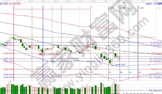 通過江恩理論系統趨勢、時間、價格工具綜合評判市場二星看多(五星評級標準)。周四市場低開在15分鐘藍線關鍵位置后止跌反彈,截止收盤反彈至生命線壓力2610附近,此位置同時也是60分鐘生命線位置、也是江恩四方圖中的270度位置,則周五應重點關注2610一線,強勢突破則繼續看高2680一線,反之,仍將回落洗盤。操作上,日線股指仍處于生命線下弱勢區,整體倉位嚴格控制在3-5成,激進客做好風控的前提下,低吸博弈短線機會。10月為月線重要時間點,最后幾個交易日,市場波動劇烈是價格追隨時間的一種表現,中長期趨勢能否自此揚帆,靜待月線收盤。