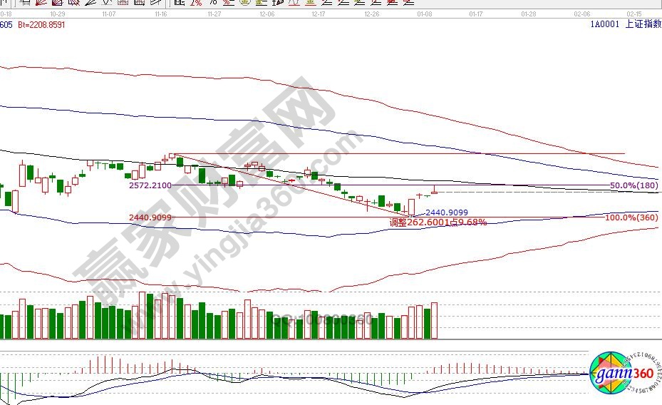 大盤日K線反彈至短線目標位黑色生命線2585附近回落,早盤10:53分贏家江恩系統工具用戶群提示短線高拋,鑒于市場目前依然處于反彈周期內,指數震蕩整理修整短期走勢后,還有機會再度攻擊黑色生命線??臻g點位上,江恩百分比延伸線提示2530、2516為10點盤中支撐,2567點為盤中壓力,時間窗口,1月15日、23號為日線時間窗口。操作策略,大盤短線反彈接近目標位,后續轉為震蕩,30分鐘生命線2516附近不破,9號短線高拋的籌碼逢低接回。