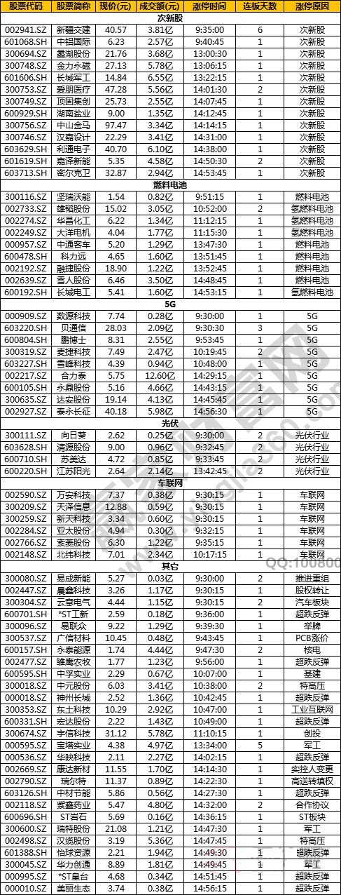 盤面上,午后次新股上演漲停潮,新疆交建(002941)收獲六連板,愛朋醫(yī)療(300753)、金力永磁(300748)等十余股漲停;燃料電池板塊午后異動,龍頭中通客車(000957)直線封板;工信部部長苗圩稱今年將發(fā)放5G臨時牌照,受此消息影響,5G開盤活躍,貝通信(603220)一字板,鵬博士(600804)、雪峰科技(603227)等多股漲停;光伏板塊延續(xù)強(qiáng)勢,江蘇陽光(600220)、清源股份(603628)等多股漲停。