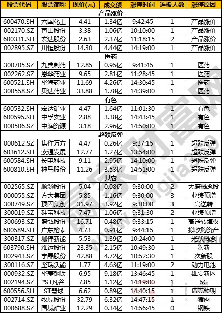 盤面上,漲價概念重歸活躍,鋼鐵、有色板塊集體走強,鋼鐵行業指數漲幅居前,華菱鋼鐵(000932)率先封板;次新股異動拉升,遠端次新雅運股份(603790)率先封板,近端宇晶股份(002943)直線漲停;煤炭板塊表現強勢,永泰能源(600157)一度漲停。強勢板塊持續殺跌,風范股份(601700)、通產麗星(002243)、東方通信(600776)等多只前期強勢股盤中觸及跌停或已跌停。