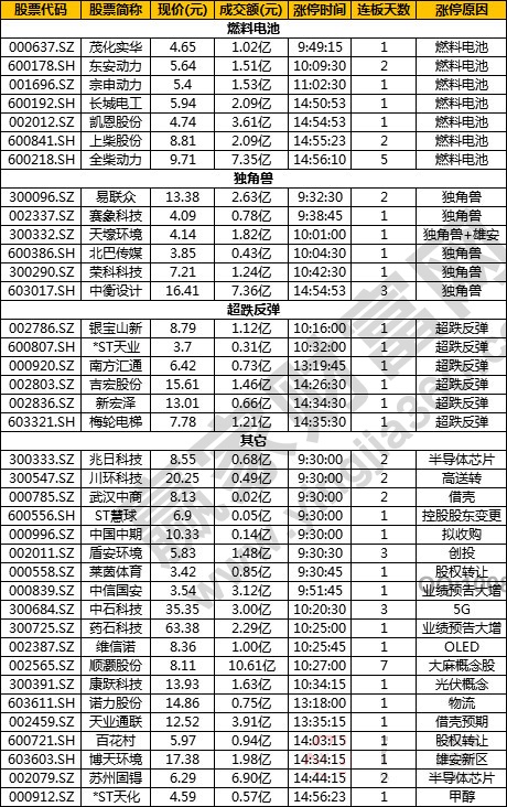 主流看點:燃料電池、獨角獸、超跌反彈 封板效率:較高