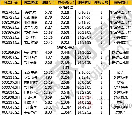 盤面上,業績預增股表現強勢,東山精密(002384)、躍嶺股份(002725)等多股漲停;業績“爆雷”股暴跌,銀河電子(002519)、大洋電機(002249)、達華智能(002512)、飛馬國際(002210)均一字跌停,人福醫藥(600079)、高升控股(000971)大跌,此前公告均顯示2018年業績“變臉”,計提商譽減值準備是重要原因。