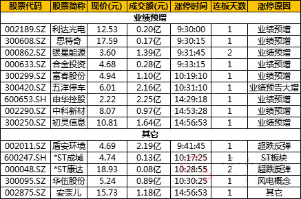 盤面上,午后多個板塊集體殺跌,兩市跌停家數驟然增多。業績“爆雷”股持續大跌,珈偉新能(300317)、宏達股份(600331)、聯建光電(300269)、華業資本(600240)、天神娛樂(002354)等均一字跌停;次新股開盤持續下挫,宇晶股份(002943)、明陽智能(601615)一度跌停;業績預增股受場內資金追捧,銀星能源(000862)二連板,利達光電(002189)、思特奇(300608)、合金投資(000633)等多股漲停。