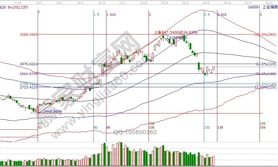 大盤自5月第一個江恩時間窗口8號、9號,與江恩價格形成時價四方信號,按預判短線反彈已展開一周,同樣參與者也收到利潤回報。通過贏家江恩分析體系判斷,短線動作還能延續,隨著時間5月第二個時間窗口17號臨近,需要關注波段百分比延伸線2倍零度位2966點反壓力,此線附近會有反復,獲利豐厚者可以選擇高拋部分籌碼,待確認反彈延續性后再度參與。首次關注贏家江恩的學員可查看歷史,4月22號盤后大勢分析提醒倉位降至3成,4月25號低風險者可以空倉休息,5月8號開始再度進場,規避風險參與反彈,皆是通過贏家江恩體投資系判斷。16號盤中支撐是135度2911點,盤中壓力270度2961點,本周五17號是5月第二個時間窗口。操作策略,指數擊破黑色生命線進入弱勢區域,目前處于短線反彈周期,高風險者倉位3-4成,低風險者等待中期參考位。