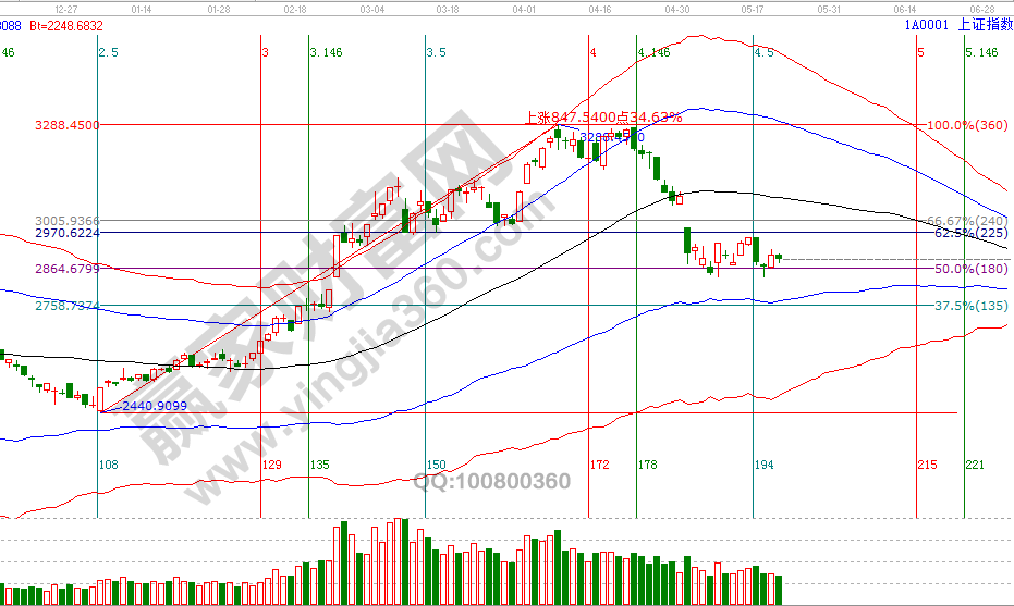 23號是贏家江恩系統江恩時間短周期窗口,同時明天將確認空間價格上一關鍵位,具體VIP學員可以通過極反通道查看60分鐘生命線。此線的重要性22號分析中已談到,得失影響著市場是否回探藍色下軌線及橫盤整理的時間。高風險者在2840附近參與的籌碼,要有足夠的耐心和充分的風險控制能力,日線藍色下軌線是底線,待整固結束后市場必會有一波反彈到生命線的機會。5月最后一個日線時間窗口是28(29)號。23號盤中壓力是180度2928點、225度2944點,盤中支撐是0度2860、45度2877點。操作策略,指數擊破黑色生命線進入弱勢區域,高風險者倉3-4成,低風險者本周進入備戰期擇機參與。