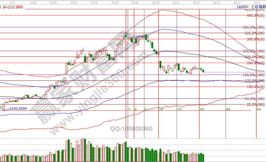 6月第一個時間窗口4、5號,日K線再探江恩輪中輪(2847點)、江恩箱2*1線(2850點)位置,今天最低點(2851點)同江恩箱所提示的支撐位僅1點之差,同時波段百分比延伸線1倍循環180度2834點,多個價格工具共振區,綜合結論是2840附近為強支撐,5月份三次下探后均展開不同程度的反彈。目前時間窗口繼續關注2840附近支撐,此線如失守則調整短線應對策略,下方為極反通道藍色下軌線。贏家江恩交易體系中強調,只在關鍵位進行交易,如4月22號失守極反通道上軌線減倉,4月25號再度減倉或空倉,5月9號參與反彈等等。明天將揭曉拐點是否形成,6月第一個時間窗口如產生不了轉折,則下個時間窗口13號是日、周線共振,級別要大于近期時間窗口。5號盤中壓力是45度2877點、90度2894點,盤中支撐是315度2844、270度2829點。操作策略,指數擊破黑色生命線進入弱勢區域,整體持倉保持在3-4成,做到進可攻退可守。