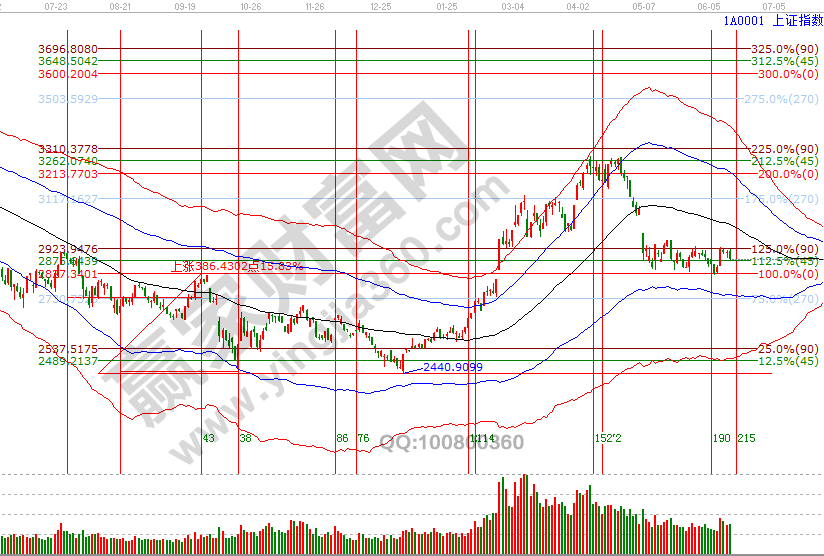 指數高開后一路震蕩走低,收盤正好落在近幾天談到的關鍵位2880附近,周一17號是日線時間窗口,關注好周末外部因素動態,江恩價格四方形、60分鐘極反通道生命線(2880-2890)區間能守住則反彈延續,失守則策略調整為區間交易法應對,下方波段百分比延伸線1倍循環180度2834點依然是強支撐。最后說下,自5月以來對市場定性的為反彈,并且給出第一目標位2950位置,第二目標位是日線黑色生命線,保持平和的心態應對市場。6月17號盤中支撐是0度2860點、315度2844點,盤中壓力是90度2894、135度2911點。操作策略,指數處于極反通道弱勢區域的反彈走勢,時間窗口關注好2880-2890區間得失,整體持倉保持3-5成。